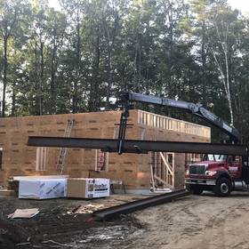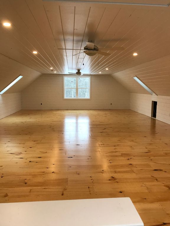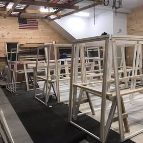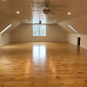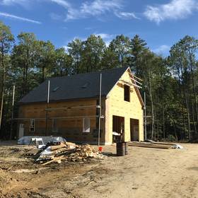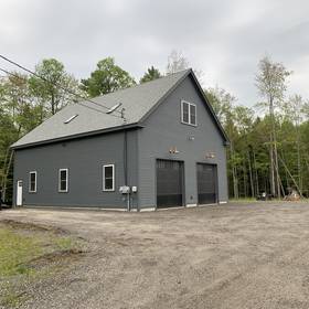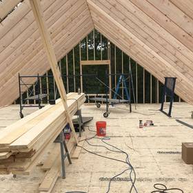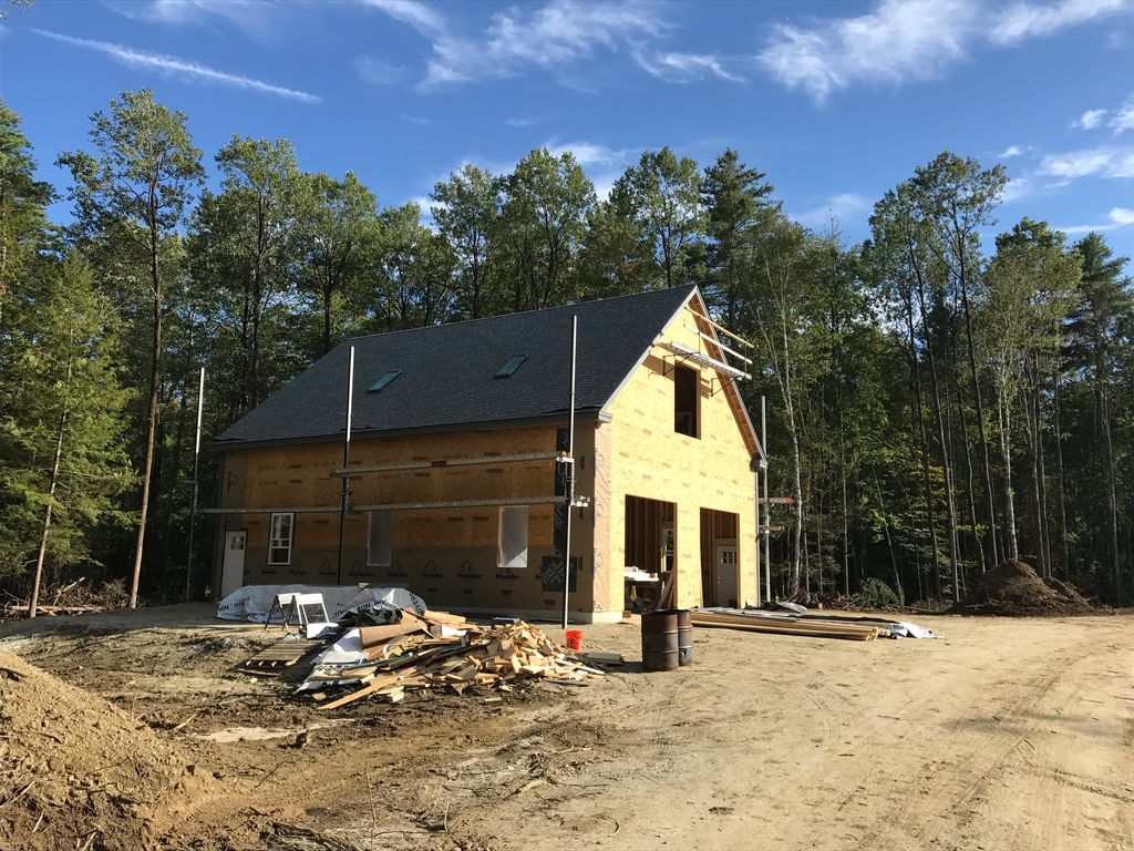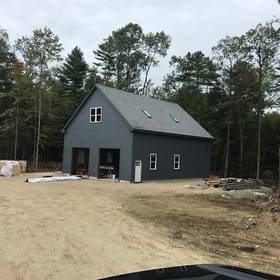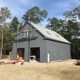 We framed the structure with 2x6 walls, 2x12 joists, two steel beams, and 2x12 rafters, insulating with fiberglass in the walls and ceiling. We used the zip system for roof sheathing and Advantech sheathing on the walls. We installed an asphalt shingle roof, vinyl windows, and pre-primed pine trim and clapboards. Shiplap pine was used for the interior walls of the shop and fire rated sheet rock for the ceiling. We then installed v-match pine on all of the office walls and ceilings and twelve inch shiplap pine planks for the office floor.
