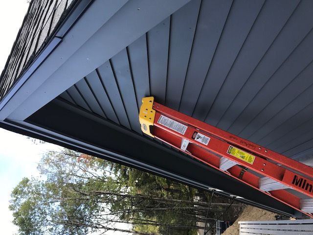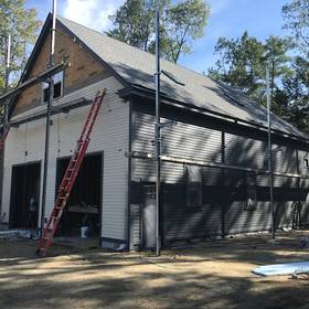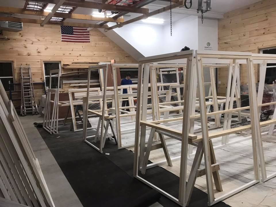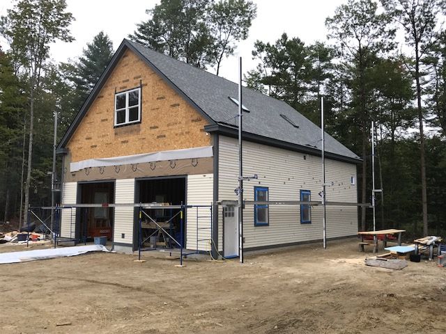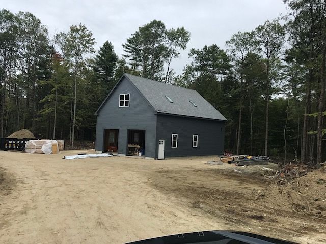 The exterior is finished with a beautiful 5/4 trim package with traditional clapboard siding to stay consistent with New England’s historic finishes. We chose to install box returns to offer nice detail and crown under the soffit for traditional finish. For a higher level of curb appeal, we chose barn style garage doors and painted them black. Copper gooseneck barn lights mounted over each garage door brought it all together. We use LED lights throughout to keep energy costs down. We installed two propane powered heaters, one for the shop and one for the office.