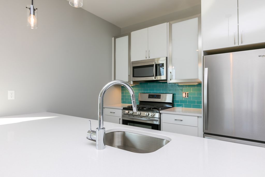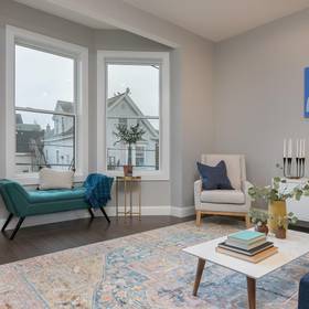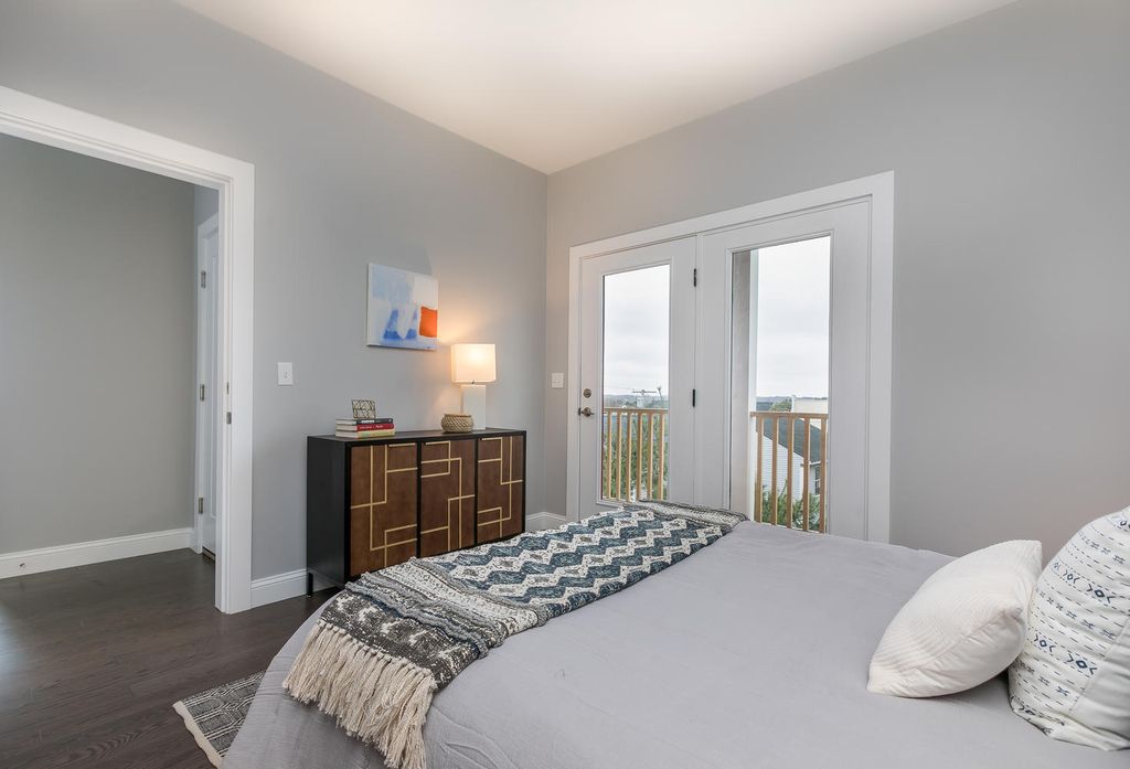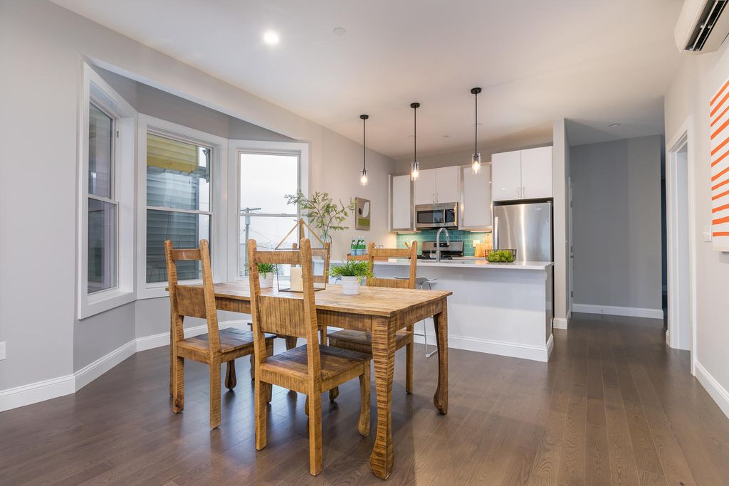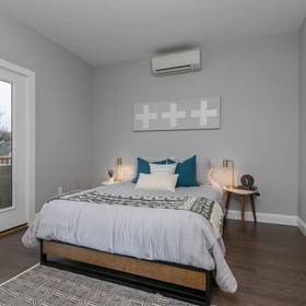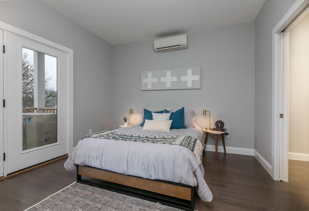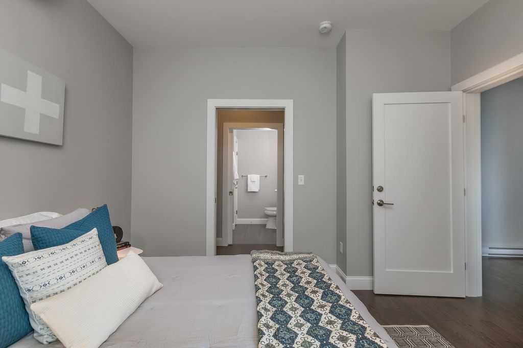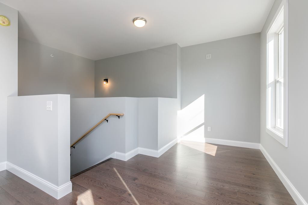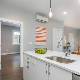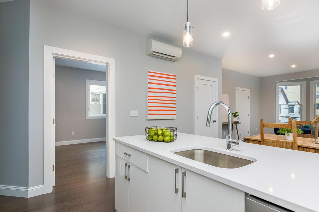 The interior portion of the renovation included installation of everything you would expect from a luxury condominium in Portland. We installed two bathrooms in each unit with high end tiles and modern vanities with quartz counter tops. Because we feel that storage is a must for city living, we created seven closets for storage including a small walk in closet in the master bedroom of each unit. We installed a modern kitchen with an 8’ long peninsula in each unit creating a contemporary take on an old galley kitchen, with hardwood floors throughout and a simple clean line trim package.