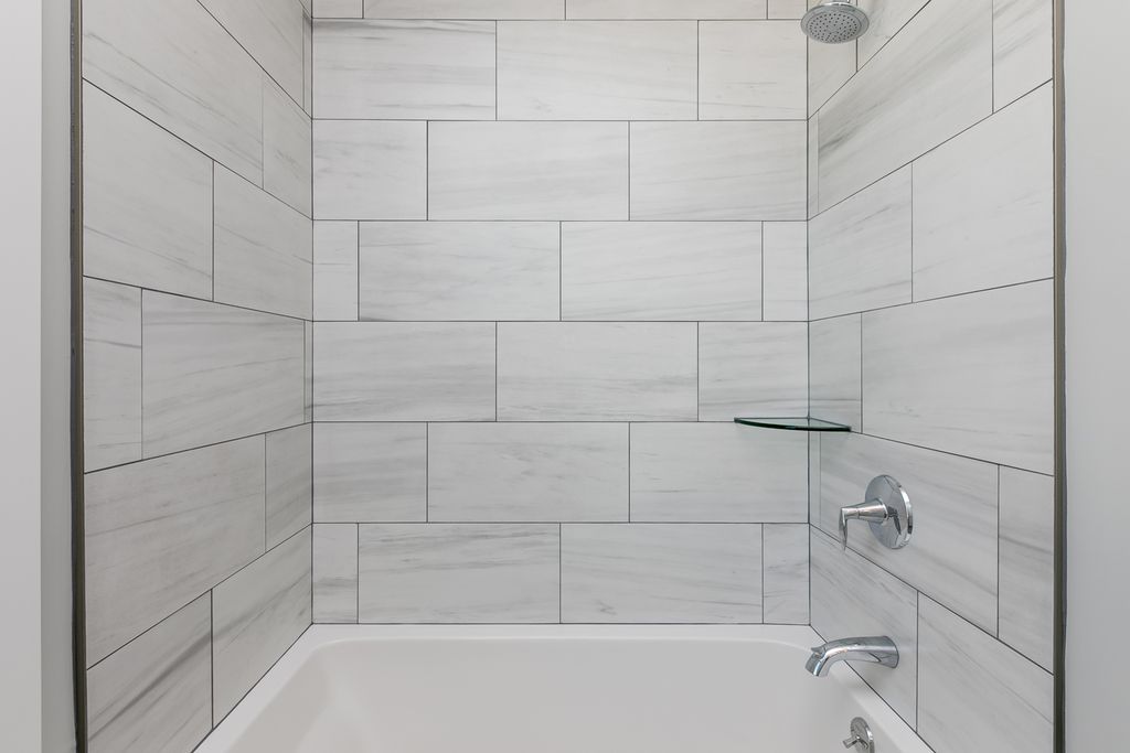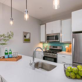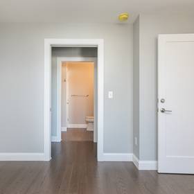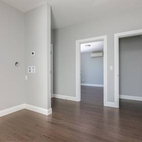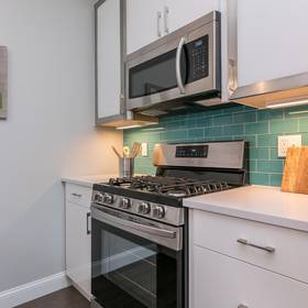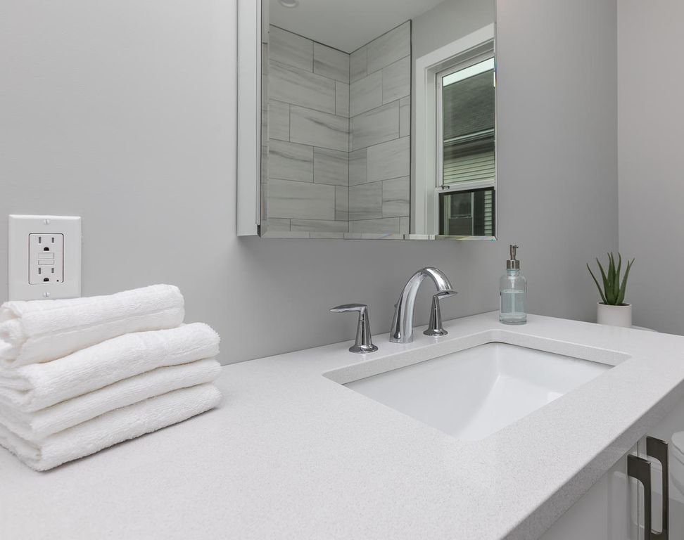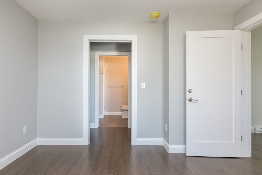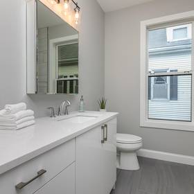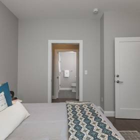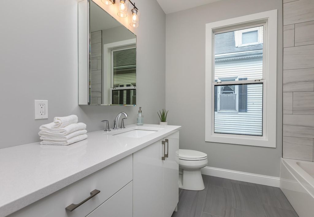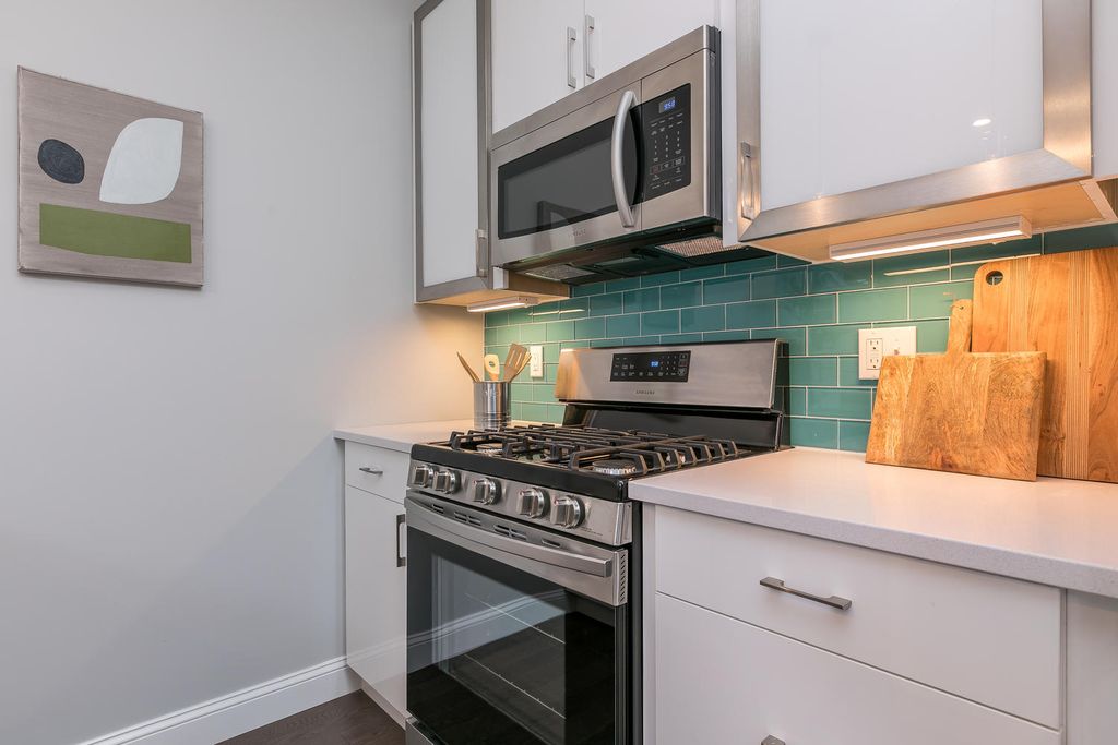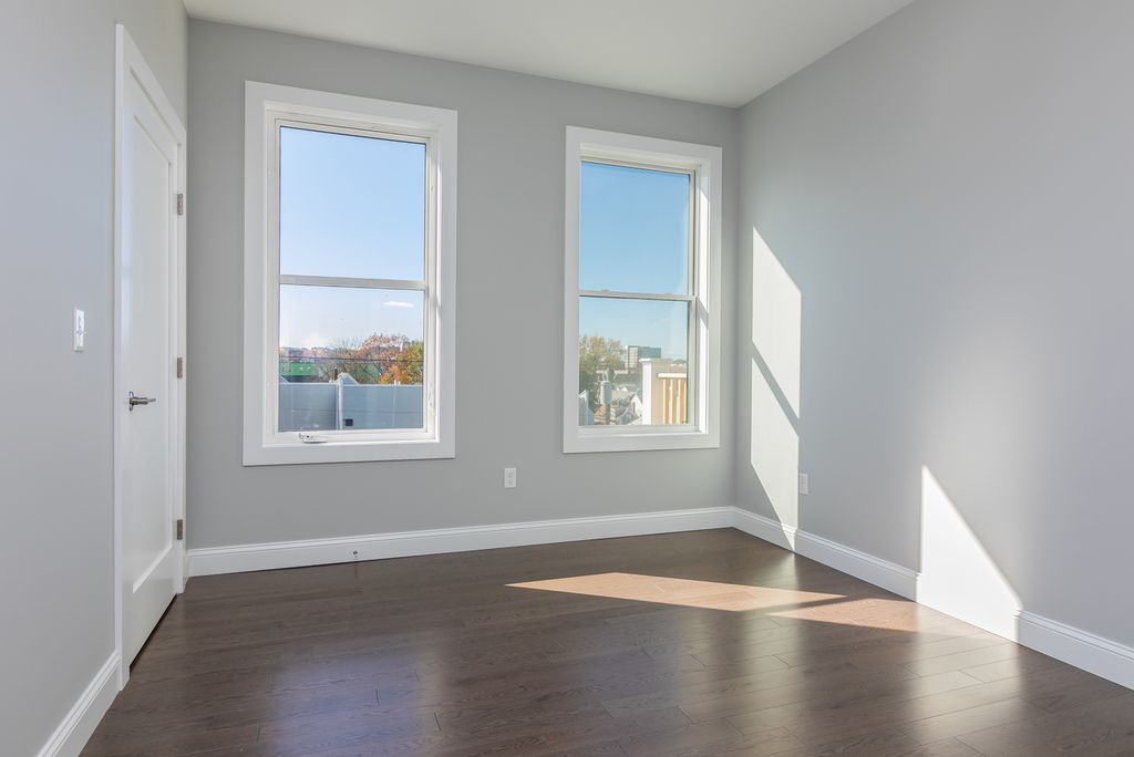The interior portion of the renovation included installation of everything you would expect from a luxury condominium in Portland. We installed two bathrooms in each unit with high end tiles and modern vanities with quartz counter tops. Because we feel that storage is a must for city living, we created seven closets for storage including a small walk in closet in the master bedroom of each unit. We installed a modern kitchen with an 8’ long peninsula in each unit creating a contemporary take on an old galley kitchen, with hardwood floors throughout and a simple clean line trim package.